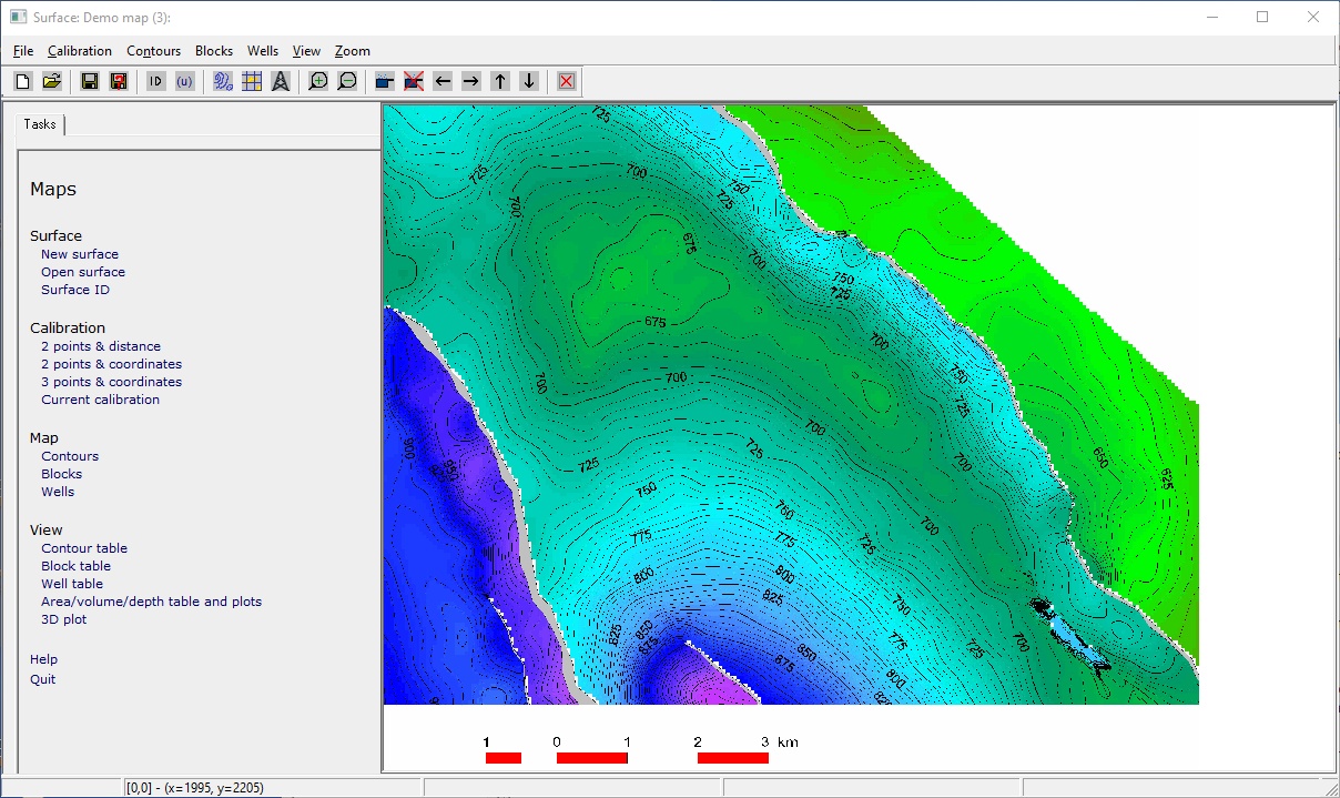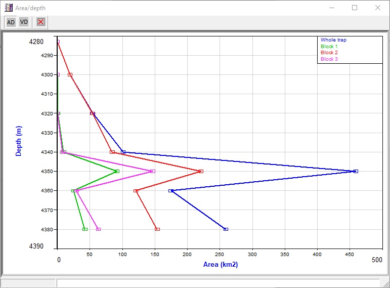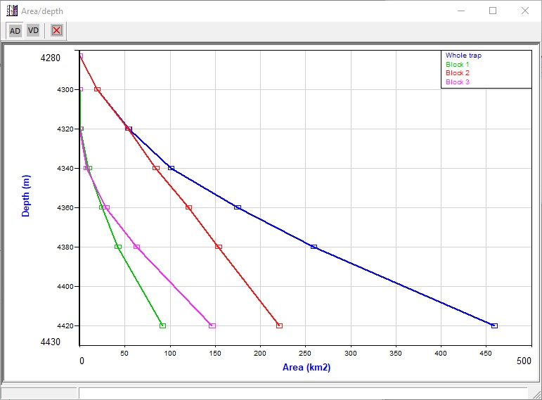 You start with an image of a contour map, digitise it using the mouse, and create a surface file (srf extension). The area/depth table stored in the srf file can be loaded into the GRV entry section of a prospect/file calculation.