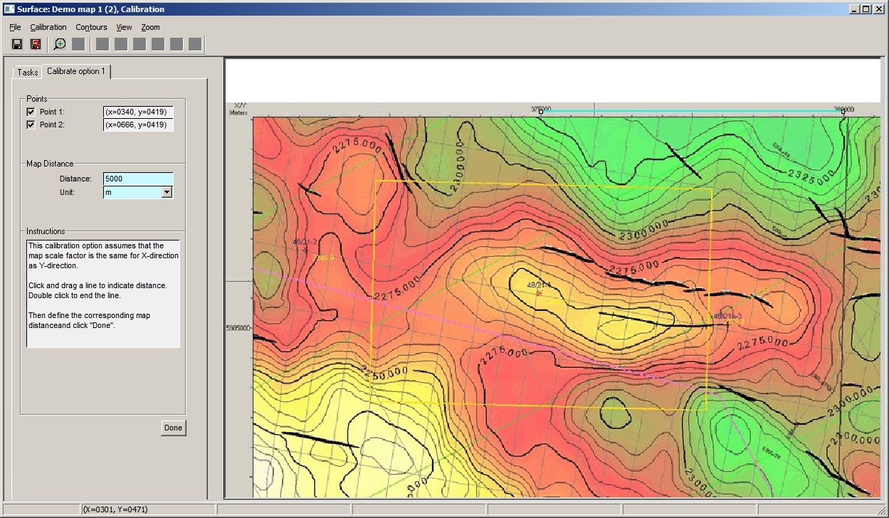 The digitisation process is simple: first you must calibrate the image using the scale bar (so it is important that this is shown on the map image). Then you trace round each contour with the mouse. With simple maps it is usually not necessary to digitise all the contours in a first pass. Later on you can always come back and trace around some more, so get more accuracy if the problem warrants it.