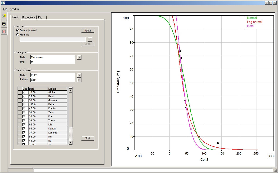 This simple facility fits normal, log-normal and beta distributions to entered data. The entered data can be from file (csv or xls) or - most conveniently - from the clipboard.