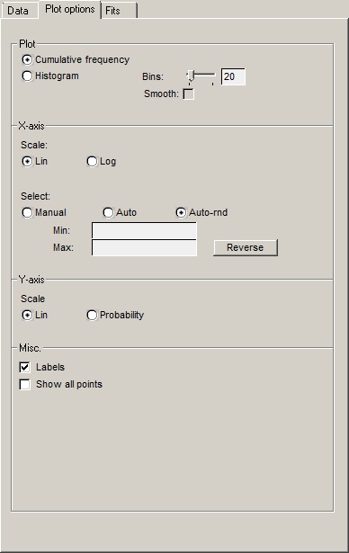 Histogram frequencies are always wanted with a linear Y axis scale. But with a cumulative frequency plot the Y axis scale can be on a linear or a probability scale. A probability scale linearises the cumulative frequency curve of a normal distribution. If the x-axis is logarithmic, the probability scale in the y-axis will linearise a lognormal distribution. |
