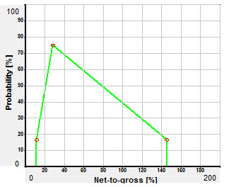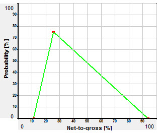 This is a relative distribution with three points. As part of the customization of the program you may choose to specify a triangular distribution in one of 2 ways: enter either minimum, most likely (mode) and maximum or P90, most likely and P10. But note that entering as P90, mode and P10 can give rise to problems. In order to calculate the minimum and maximum of the distribution, the most likely must be between the P90 and P10 values - which may not be the case. Also, the program must solve a polynomial of degree 4, and it may not be able to do this in every case. If you get unhappy distributions, click the [Style..] button to revert to the min - mode - max entry style.