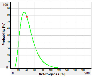 This is a skewed distribution commonly described by the P50 (which, since this is a skewed distribution, is not equal to the mean or to the mode) and the P10. The entry customization described above for the normal distribution applies also to the log-normal distribution.