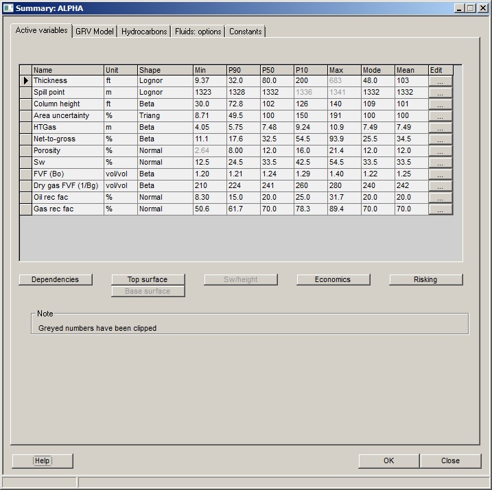 Click on the edit column to enter/edit the probability distributions for any variable. Other tabs show the set-up for the current prospect/model/layer, and the buttons at the bottom take you to the various input dialogs.
