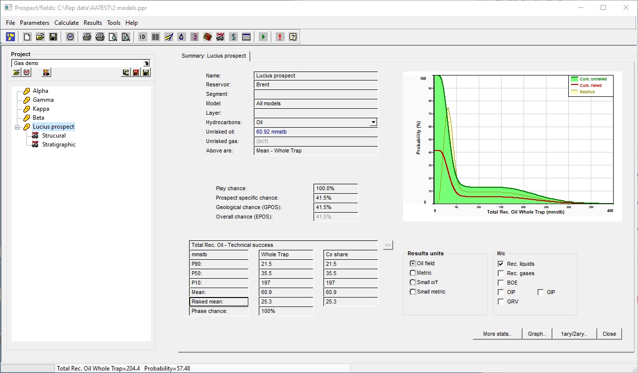 The summary shows the ID of the Prospect (and the current segment*, model and layer) at the top left of the screen. Below are shown the defined hydrocarbons, and the unrisked mean quantity of total recoverable oil (liquids) and gas. These can be either whole trap or net (company share), depending on the entry in the Installation Options.